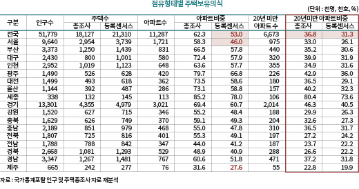 등록센서스 기준으로 아파트가 제일 적은 곳은 제주도(27.6%)이고, 대도시 중에는 서울(46%)이 가장 적다. 전국 광역시의 아파트 비중은 모두 50%를 넘어섰고, 광주와 경기도 지역은 60%를 넘는다. 따라서 광주와 경기도에서 아파트사업을 할 때는 다른 지역보다 수요