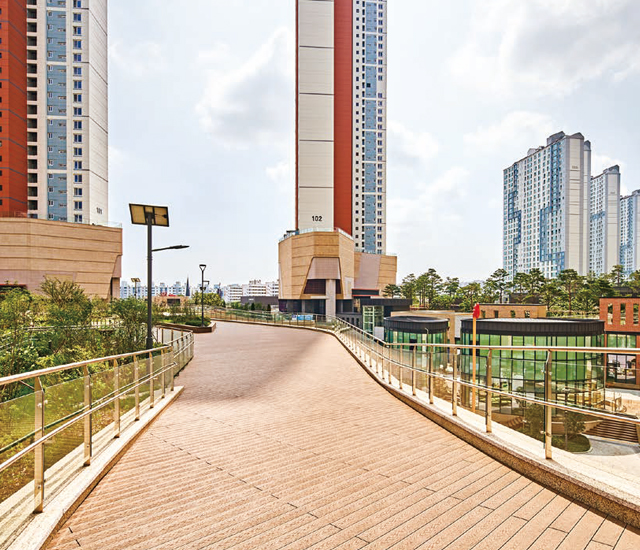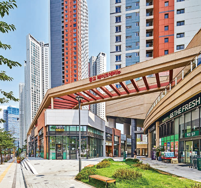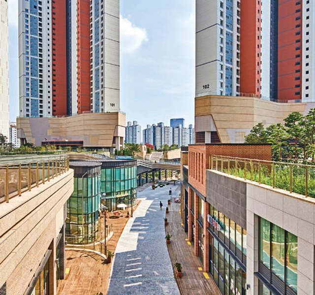 단지 내부의 전경. 지상을 중심으로 상업시설과 주민 편의시설들이 모여 있다.