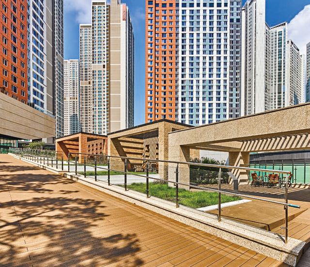 오피스텔과 상업시설은 완벽히 분리했다. 4층 이상에 오피스텔을 배치하고 주차장은 100% 지하화했다. 오피스텔 4개동이 지상 20m 높이에 자리하며 순환데크로 연결되는 구조다. 335m 길이의 순환데크를 중심으로 조경과 휴식시설을 배치해 산책로로 손색이 없다. 이밖에도 여러 개로 조성한 단지 내 산책로가 총 1.2km에 달한다. 단지 내 조경에도 힘을 실었다. 조경공간이 약 3만 2,000㎡로 축구장 약 4배 크기다.