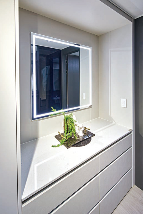 대리석 상판을 깔고 조명이 내장된 거울을 부착해서 고급스럽게 연출한 안방 화장대. 넉넉한 서랍장도 제공한다. -