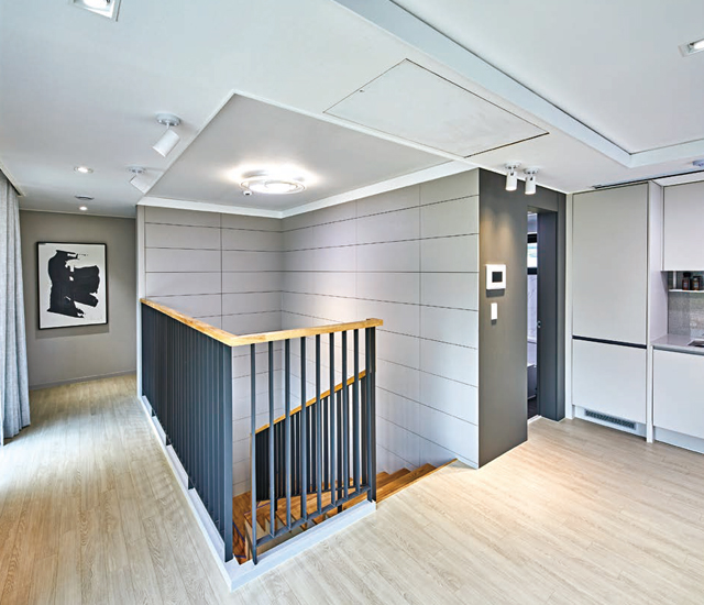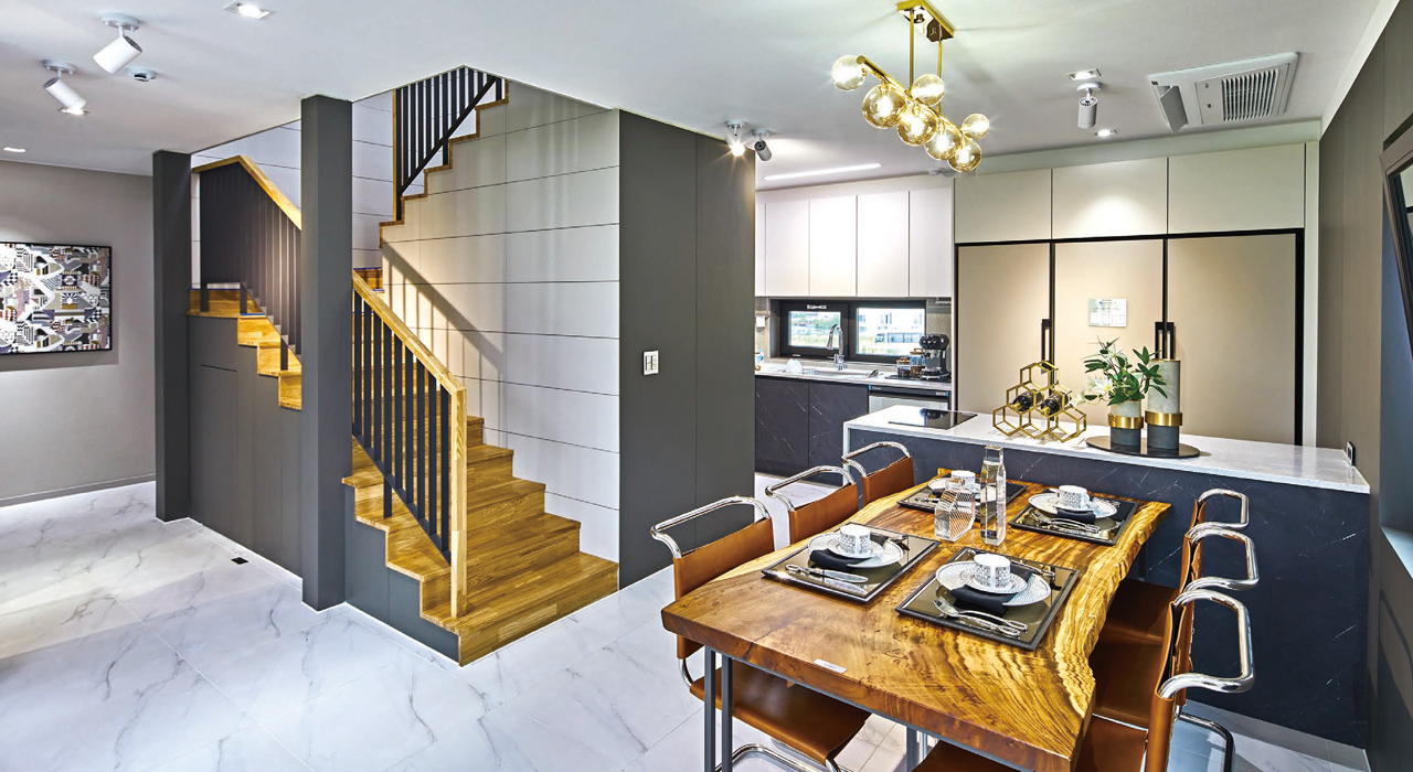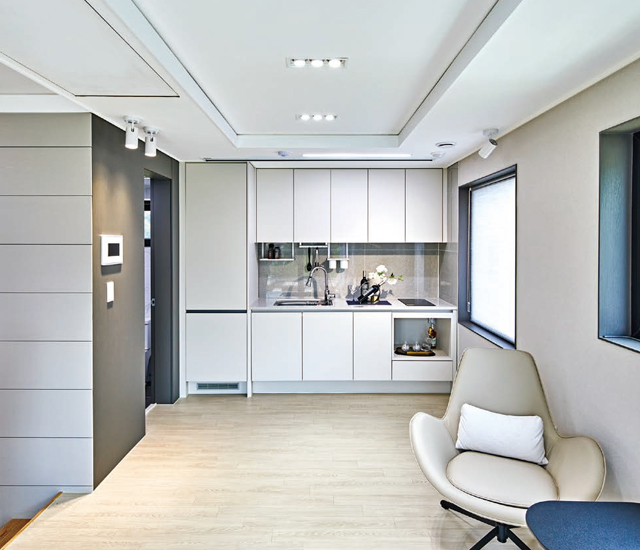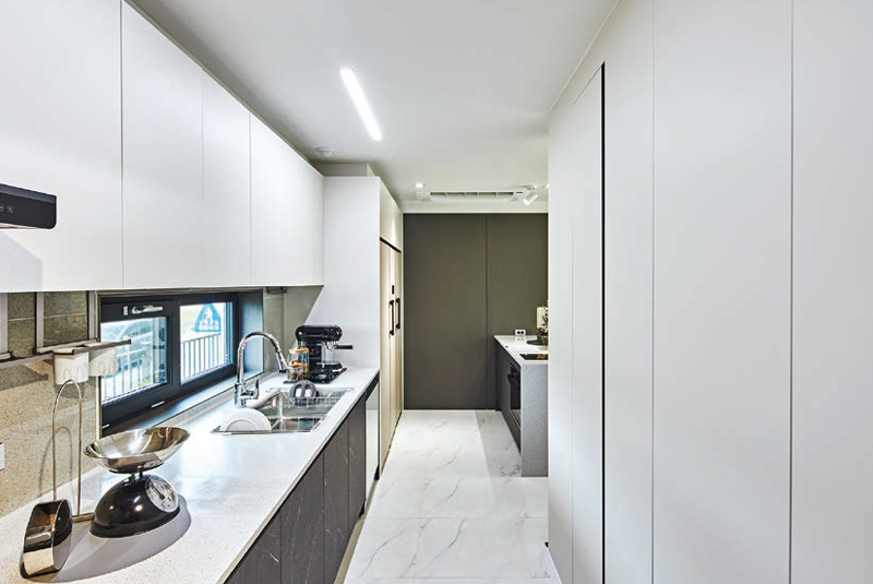 실내 가운데 계단실이 자리한다. 계단실을 중심으로 오른편에 자리잡은 주방공간에 넓고 긴 형태의 아일랜드 작업대를 두어 거실과의 소통을 이끌고 있다.-