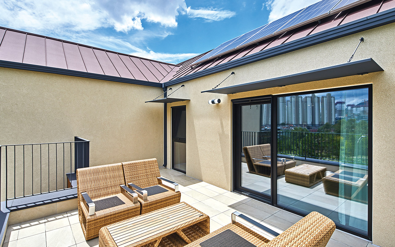 2층 거실에서 드나들 수 있는 넓은 테라스가 마련된다.지붕에 보이는 3kW 태양광발전 패널이 기본으로 설치된다.