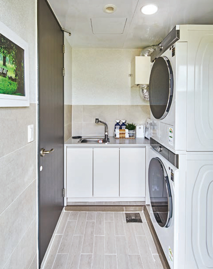개수대, 세탁기, 건조기를 이용할 수 있는 공간이며 뒷마당과 연결된다.
