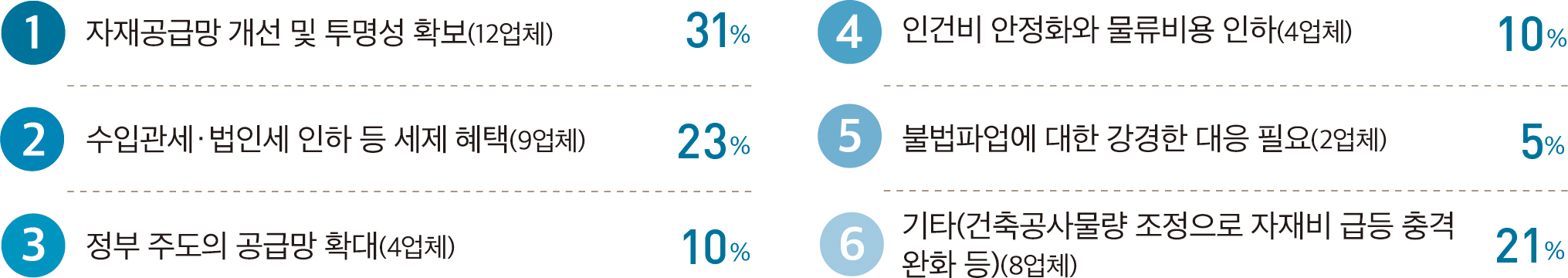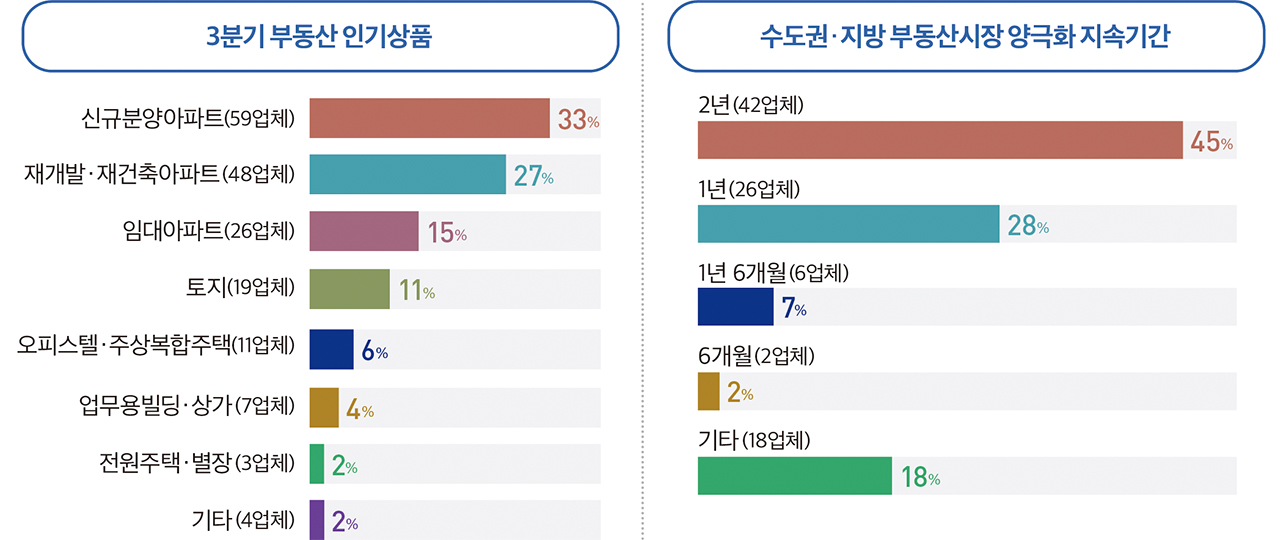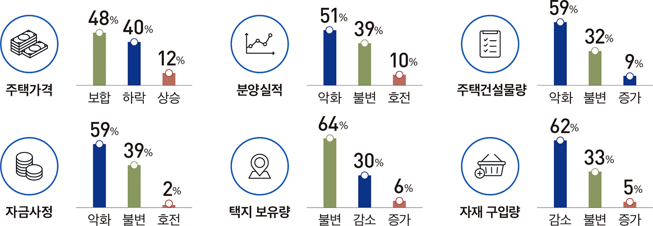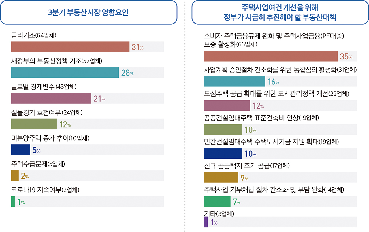 설문에 응한 94개 주택건설업체 중 34개 업체(36%)가 2022년도 3분기의 주택경기를 2022년도 2분기와 비슷할 것으로 응답했으며, 53개 업체(56%)는 2분기보다 침체될 것으로 내다봤다. 이는 2분기 주택경기 전망〔불변(46%), 회복(30%)〕보다 매우 악화된 수준이다. 최근들어 러시아·우크라이나 전쟁 장기화 등에 따른 원자재가격 급등, 글로벌 경기침체 우려, 점진적인 금리인상 불가피 등의 원인으로 부동산 시장이 경착륙할 것이라는 우려에 따른 것으로 풀이된다.