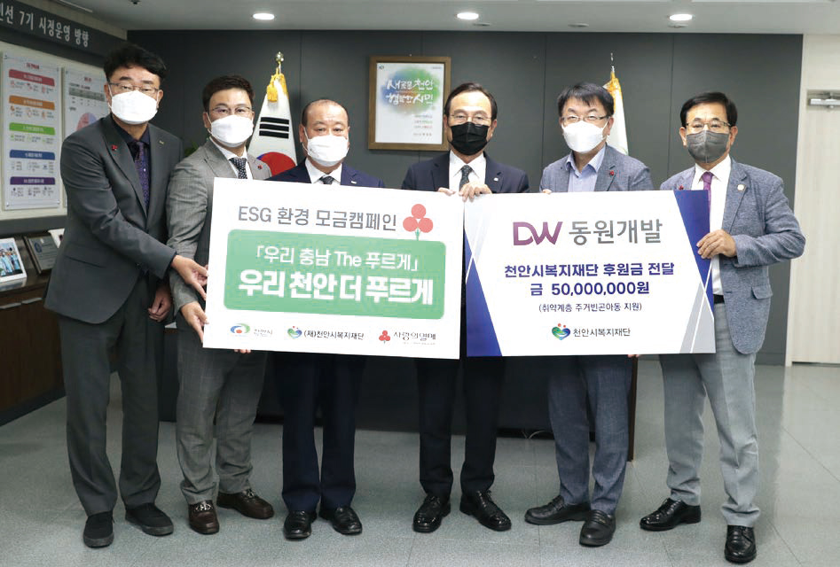 (주)동원개발(회장 장복만, 부산시회 고문)은 6월 27일 천안시청을 방문해 취약계층 주거빈곤 아동가구 주거복지 향상을 위한 후원금 5,000만원을 전달했다. 이번에 전달한 기탁금은 천안 주거빈곤 아동가구의 주거 안정성 향상에 쓰일 예정이다. 동원개발 이성휘 사장은 “이번 후원이 지역내 주거복지 향상에 도움이 되길 바란다”고 말했다.