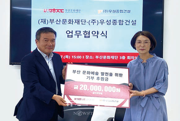 (주)우성종합건설(회장 정한식, 부산시회 이사)은 7월 7일 부산문화재단과 업무협약을 체결하고 기부 후원금 2,000만원을 전달했다. 양 기관은 예술가 활동기회 및 여건 향상, 시민 문화향유 기회 확대를 위해 협력하기로 했다. 우성종합건설 임채범 대표는 “앞으로도 부산문화재단과 협력하여 부산 예술인들을 후원하는데 앞장서겠다”고 전했다.