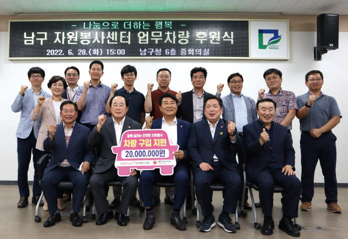 (주)영무건설(회장 박재홍, 중앙회장, 사진 앞줄 가운데)은 6월 28일 광주 남구청 자원봉사센터에 2,000만원 상당의 캐스퍼 차량을 기증했다. 박재홍 회장은 “1년 365일 지역사회를 위해 다양한 봉사활동에 힘쓰고 있는 자원봉사센터에 작은 힘이라도 보태기 위해 지원에 나섰다”며 “앞으로 지역과 상생하는데 앞장서겠다”고 말했다.