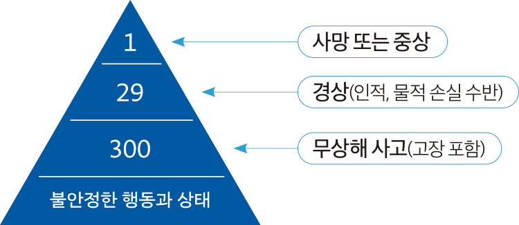 이 법칙은 산업재해 중에서도 큰 재해가 1번 발생했다면 그전에 같은 원인으로 29번의 작은 재해가 발생했고, 또 운좋게 재난은 피했지만 같은 원인으로 부상을 당할 뻔한 사건이 300번은 있었다는 것을 발견함 -
