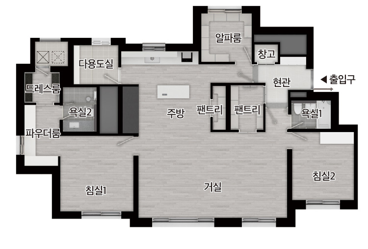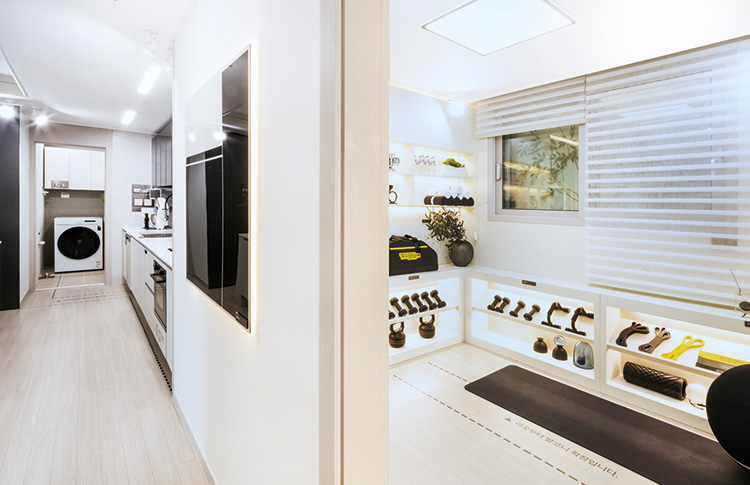 현관에서 주방으로 바로 들어가는 순환동선을 선보이고 있다. 현관과 주방이 연결되는 복도에 알파룸이 자리하는데 큰 창이 있어 환기가 잘 된다.