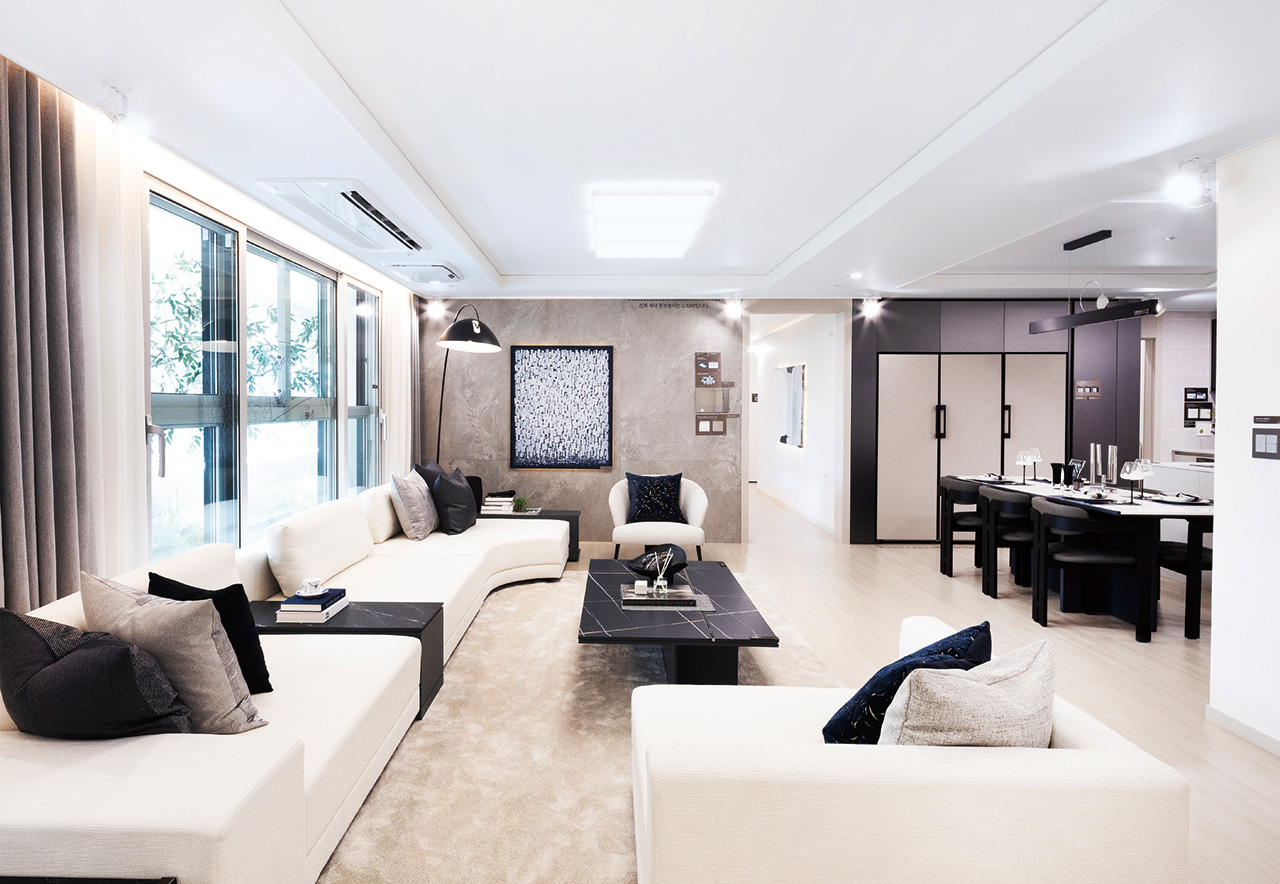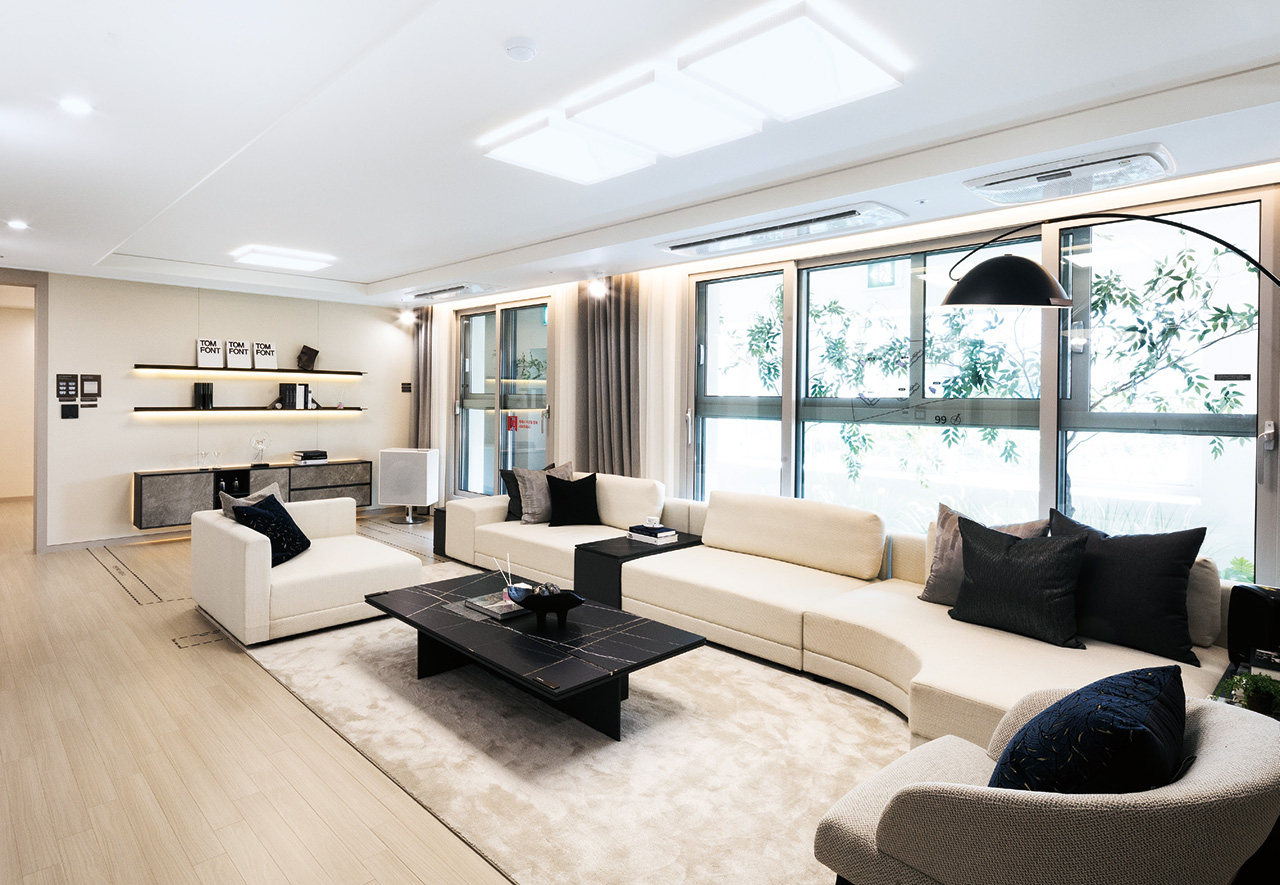 거실 우물천장을 기존 2.4m 보다 12cm 높여 개방감을 확보하고 있다. 거실 아트월은 큼지막한 세라믹타일로 시원하게 연출하고 바닥은 강마루를 기본으로 시공한다. 천장형 공기청정기도 기본 품목이다. 조명 스타일업 옵션으로 집안 분위기를 화사하게 연출해 볼 수 있다.