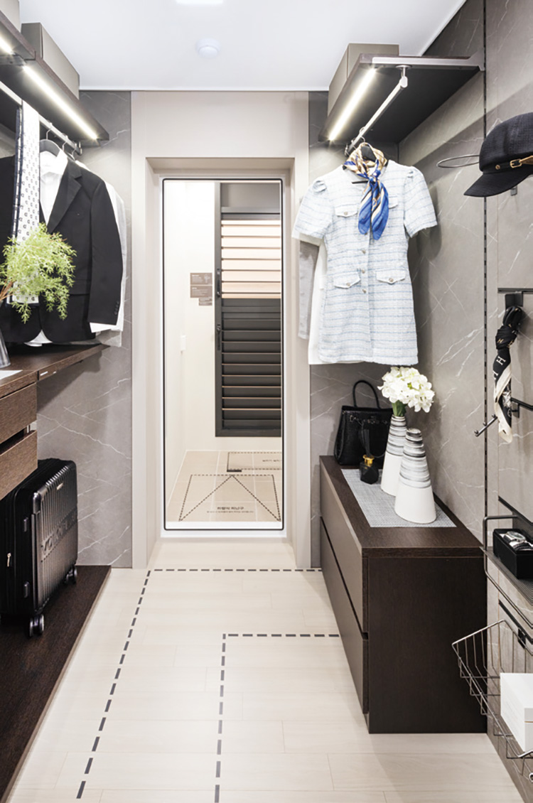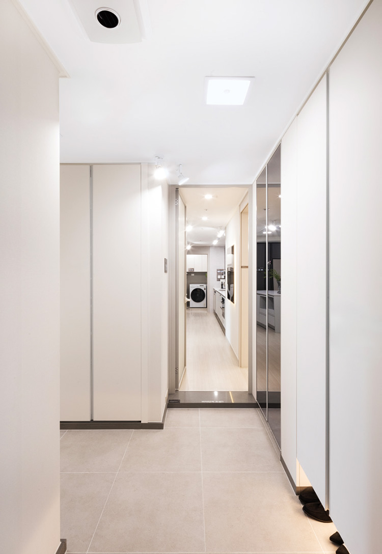 현관에서 주방과 복도 양방향으로 진입할 수 있는 순환동선을 적용하고 있다. 각각의 중문을 선택할 수 있는 옵션이 제공되며 현관 에어샤워 옵션도 있다.