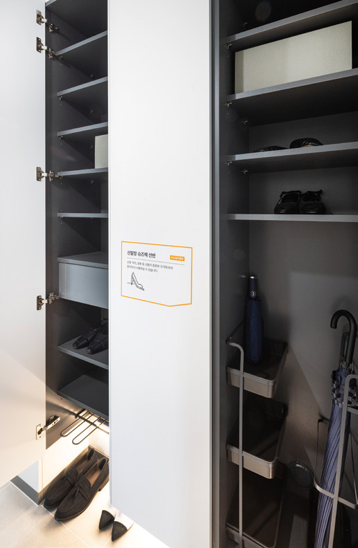 우산꽂이를 비롯해 슈즈렉 선반 등을 기본으로 설치해 다양한 크기의 신발을 보관할 수 있다.