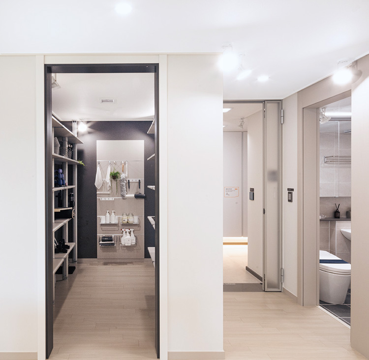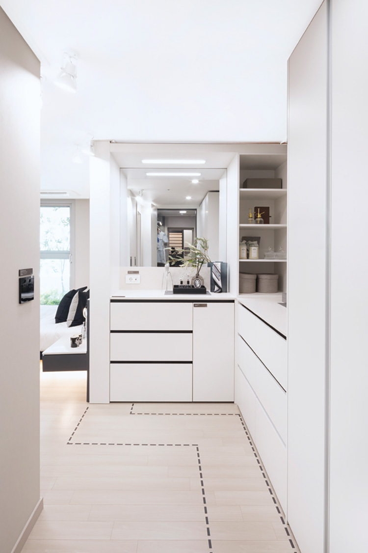 ㄱ자형 구조의 파우더장과 붙박이장이 연결되는 파우더룸을 유상옵션으로 선택하면 다채로운 수납공간을 누릴 수 있다.