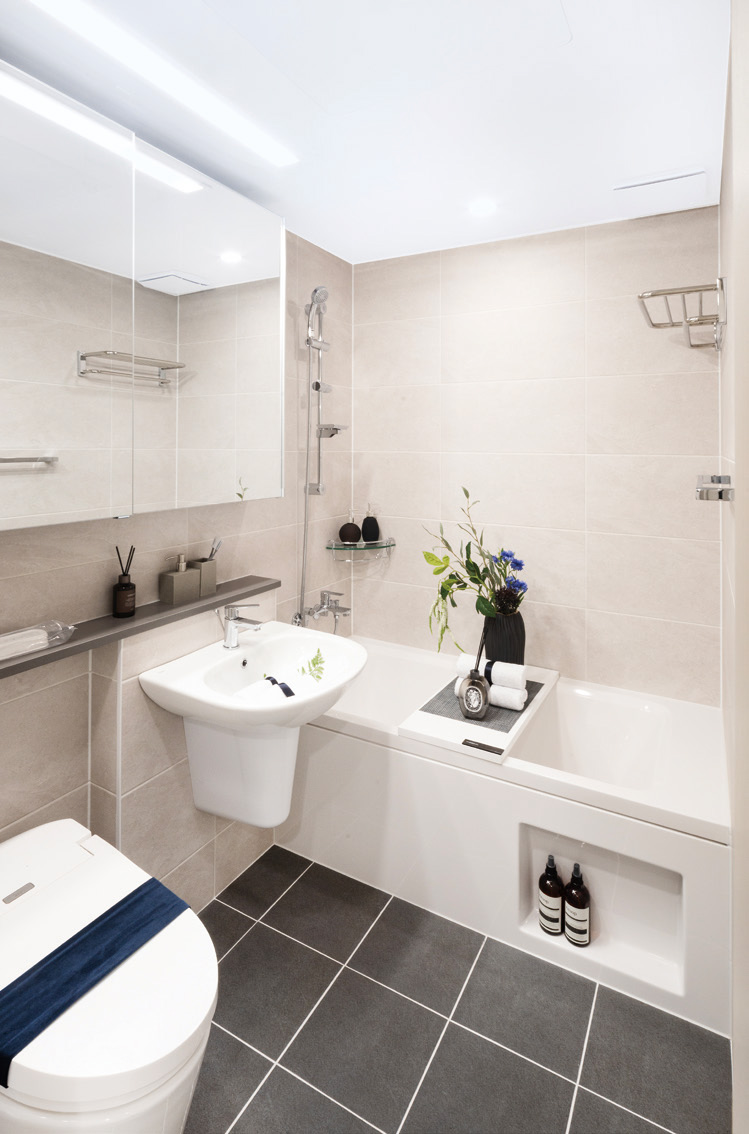 깔끔한 인테리어가 돋보이는 공용욕실이다. 욕조가 제공되며 거울형 욕실장이 장착된다. 양변기 일체형 비데는 옵션으로 선택해 볼 수 있다.