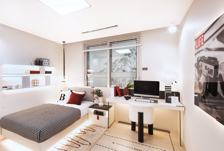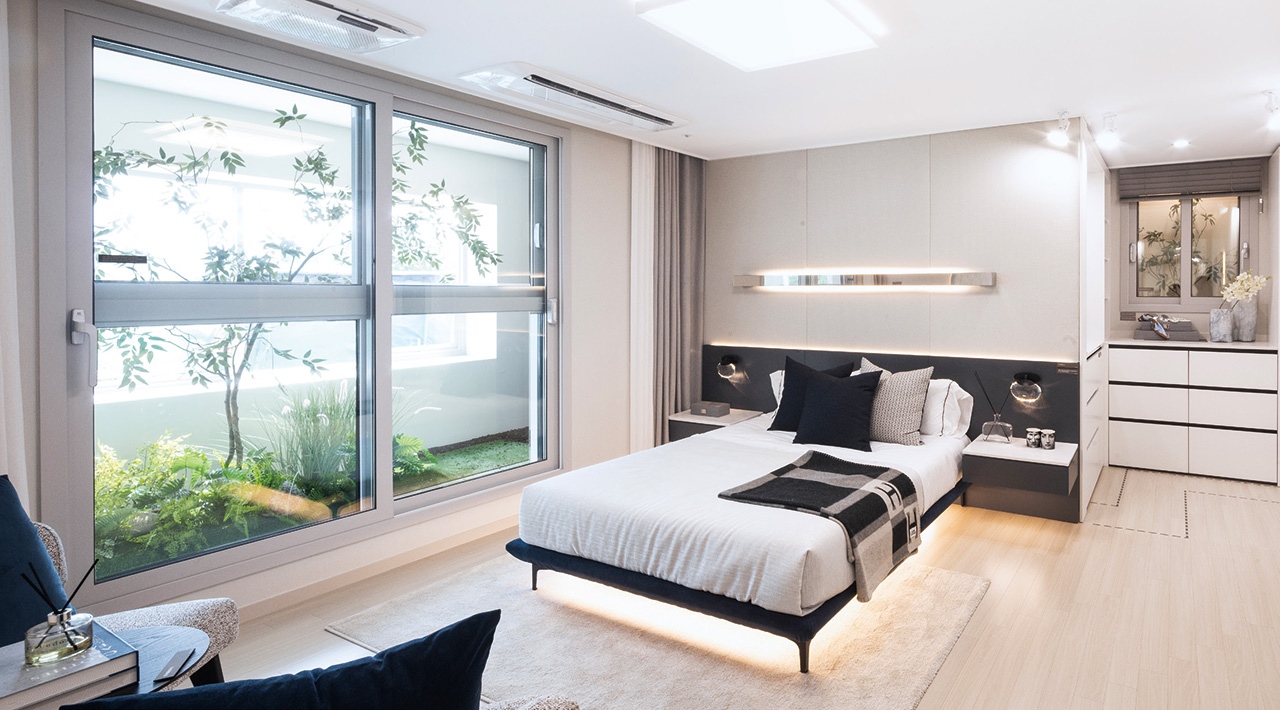 전면에 커다란 입면분할창이 있고 측면 창까지 더해져 환기와 채광에 유리한 안방이다. 천장형 공기청정기가 기본 제공되며 간접조명은 옵션으로 선택할 수 있다.