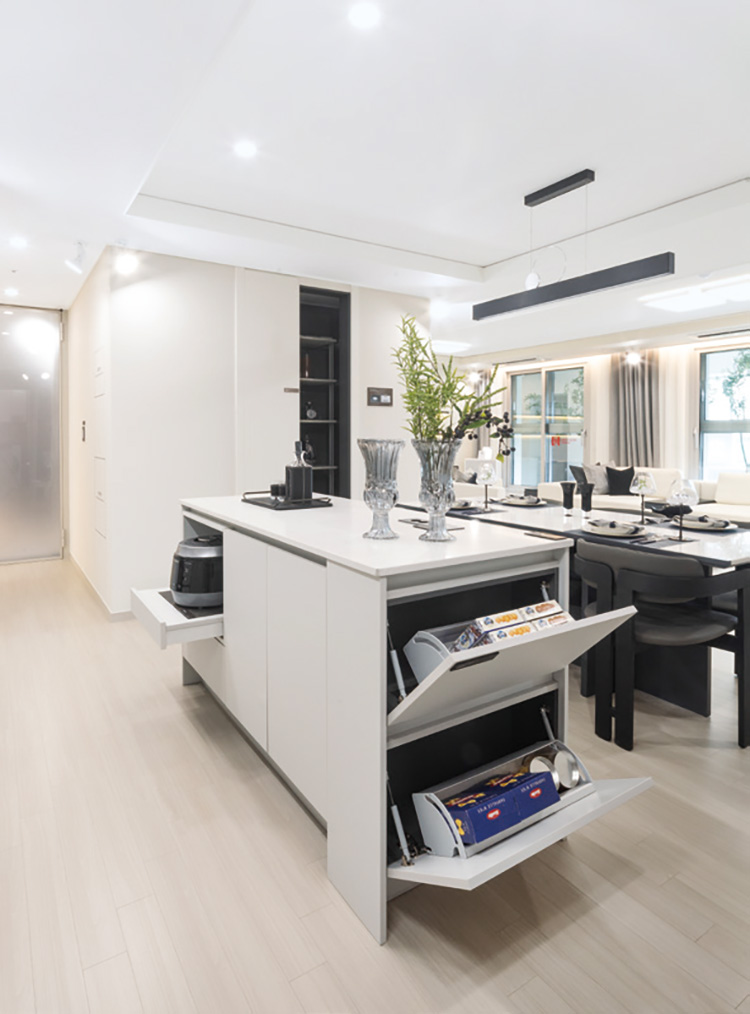 유상옵션품목으로 와이드 아일랜드장을 선택하면 최신 트렌드에 맞는 대면형 주방으로 사용할 수 있다. 아일랜드에는 측면수납장, 빌트인 콘센트 등 편리한 기능이 적용되어 있다.