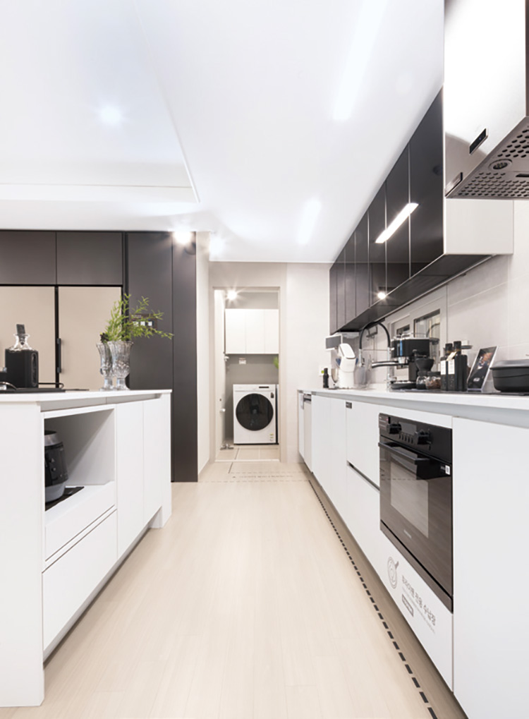 주방 상판 엔지니어드스톤, 아일랜드장, 주방 상부장 유리도어와 하부조명, 빌트인 냉장고, 인덕션, 독립형 렌지후드, 빌트인 식기세척기 등이 유상옵션으로 제공된다.