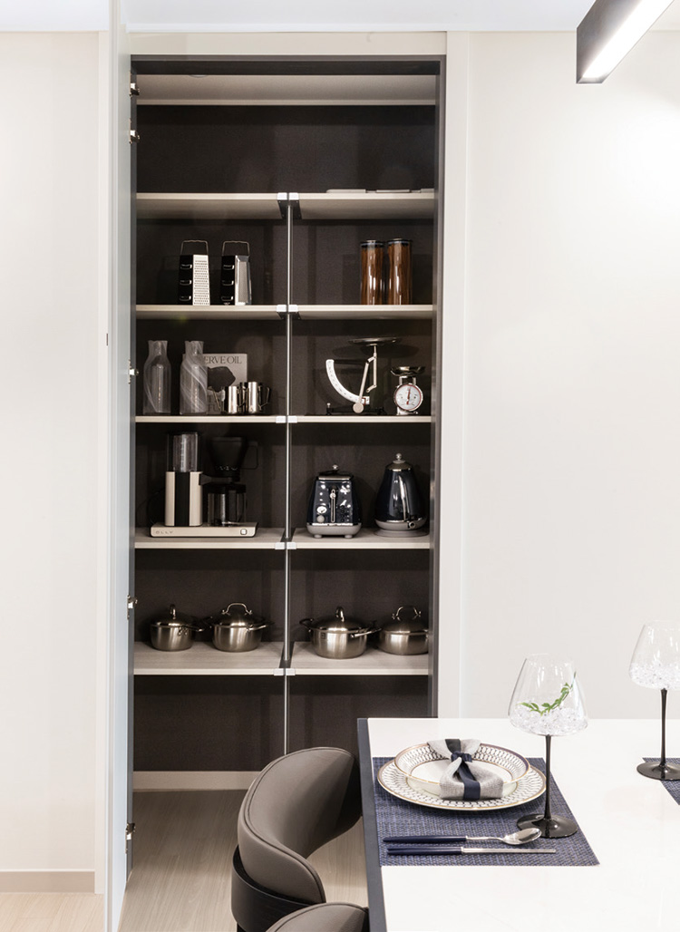 주방용품이나 대용량의 식료품을 넉넉하게 보관할 수 있는 팬트리가 다이닝공간 바로 옆에 자리한다.