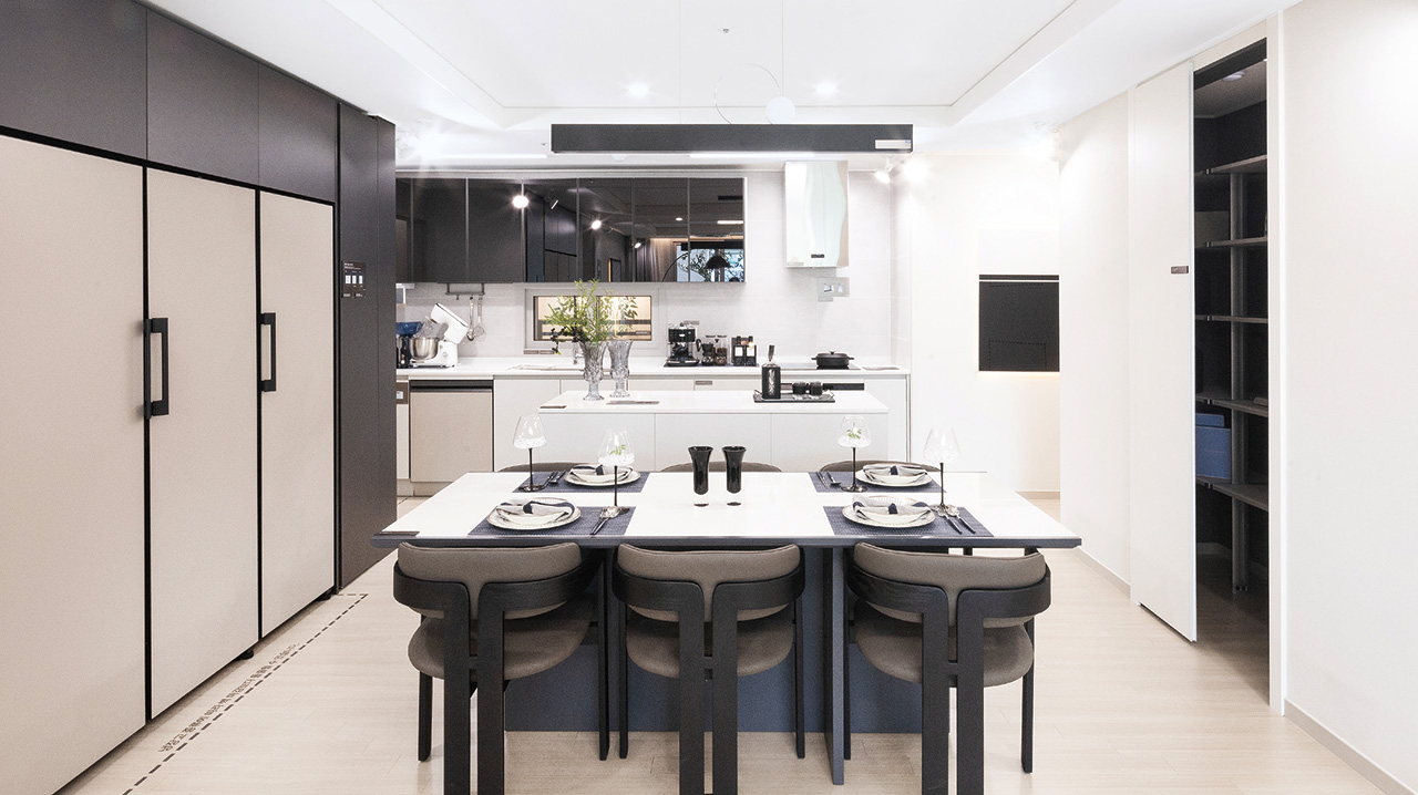 주방에도 2.52m 높이의 우물천장을 만들어 시원한 다이닝 공간을 연출한다. 조명스타일업 옵션을 선택하면 식탁 팬던트로 밝고 고급스러운 분위기를 만들 수 있다. 주방에 창문이 설치돼 거실과 맞통풍이 된다.
