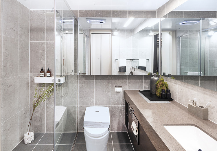 안방 욕실에는 카운터형 세면대가 적용된다. 상판은 엔지니어드스톤으로 마감해 고급스러움까지 더했다. 건식 화장실로 시공해 욕실을 깔끔하게 사용할 수 있다. 양변기 일체형 비데와 욕실 다기능 배기팬은 유상옵션이다.