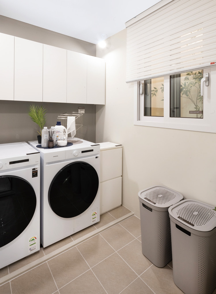 주방 옆에는 큰 창문이 있는 넓은 다용도실이 있다. 상부에 매달린 세탁수납장은 유상옵션으로 선택할 수 있다.