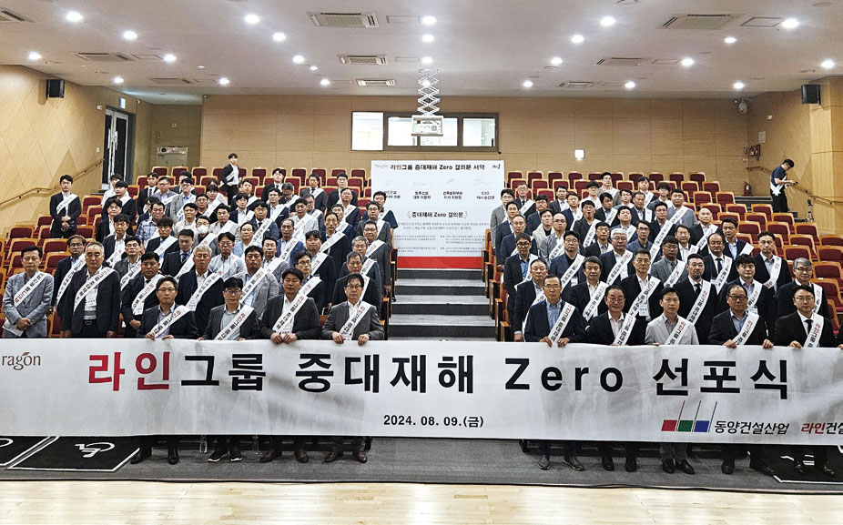 건설계열사 ‘중대재해 Zero 선포식’ 개최라인그룹〔(주)동양건설산업(대표이사 오성민, 경기도회 소속), (주)라인건설(대표이사 권윤, 광주전남도회 소속), (주)라인산업(대표이사 권혁용, 광주전남도회 소속)〕은 8월 9일 ‘라인그룹 중대재해 Zero 선포식’을 개최했다. 행사에는 계열사 임직원, 협력사 등이 참석해 중대재해예방과 안전한 근로환경 조성을 위한 의지를 다지는 시간을 가졌다.