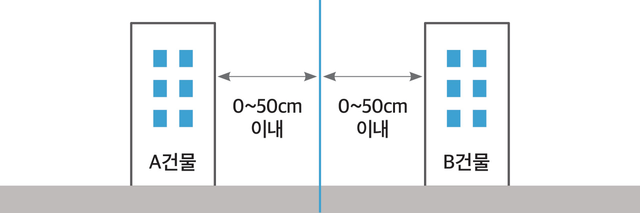 아래 그림처럼 두 건축물 사이에 공지를 50cm 이내로 할 수 있다. 또는 두 건축물의 벽을 붙여서 공지 없이도 건축이 가능하다.
