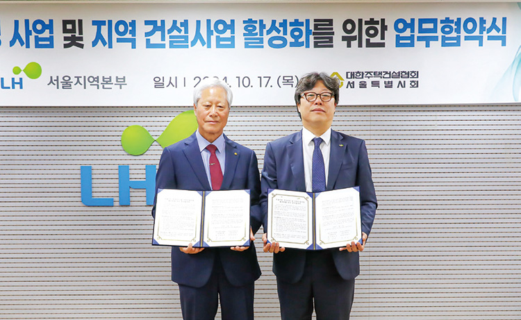 서울시회(회장 홍경선, 사진 왼쪽)는 LH 서울지역본부(본부장 박현근)와 10월 17일 서울시 주거안정과 주택건설산업의 활성화를 도모하기 위한 업무협약(MOU)을 체결했다. 협약을 통해 서울시회와 LH 서울지역본부는 업무협조 체계를 구축하여 정부 매입임대주택 공급확대 정책의 목표를 달성하고, 시민 주거안정과 건설산업 활성화를 위한 상호협력을 약속했다. 홍경선 서울시회장은 “협약식을 통해 서울시민의 주거 안정과 삶의 질 향상에 기여할 것”이라고 말했다.