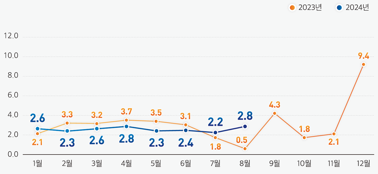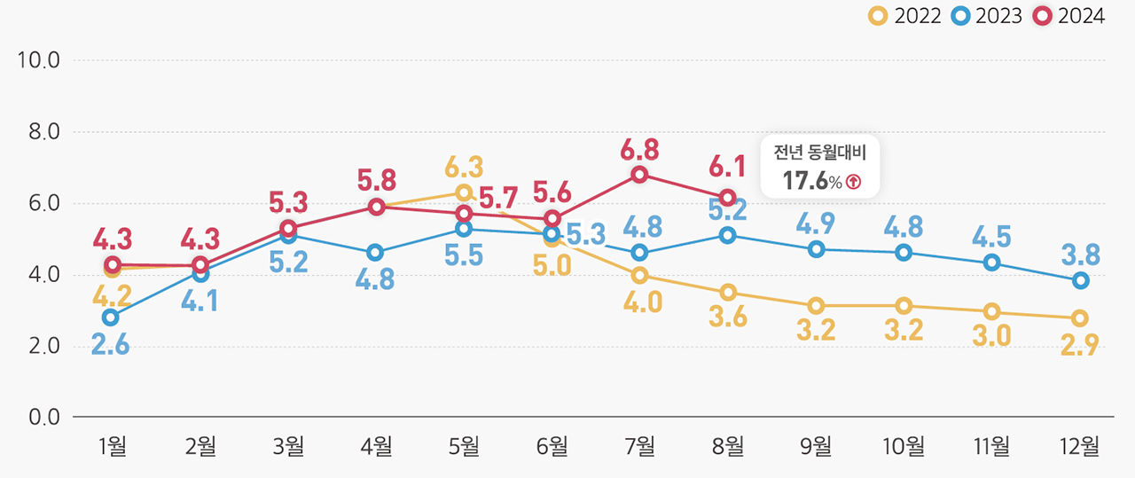 2. 주택 매매거래량 : 2024년 8월 주택 매매거래량 6.1만건. 전년 동월대비 17.6% 증가
