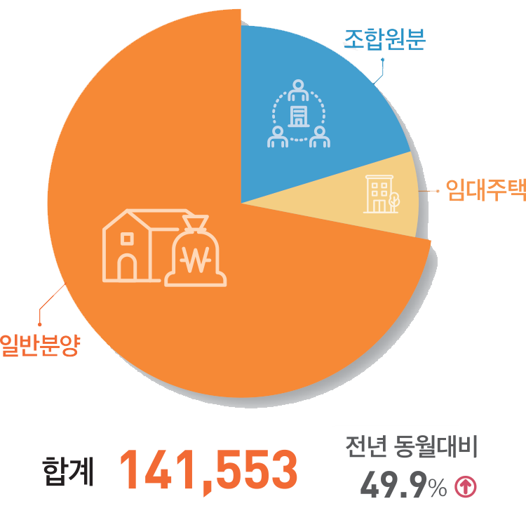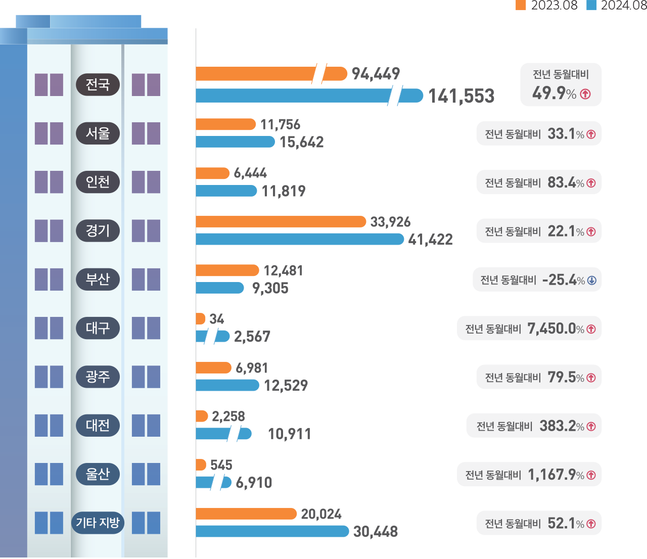 4. 분양물량 : 2024년 8월 누계 공동주택 분양실적은 전국 141,553호. 전년동기 대비 49.9% 증가