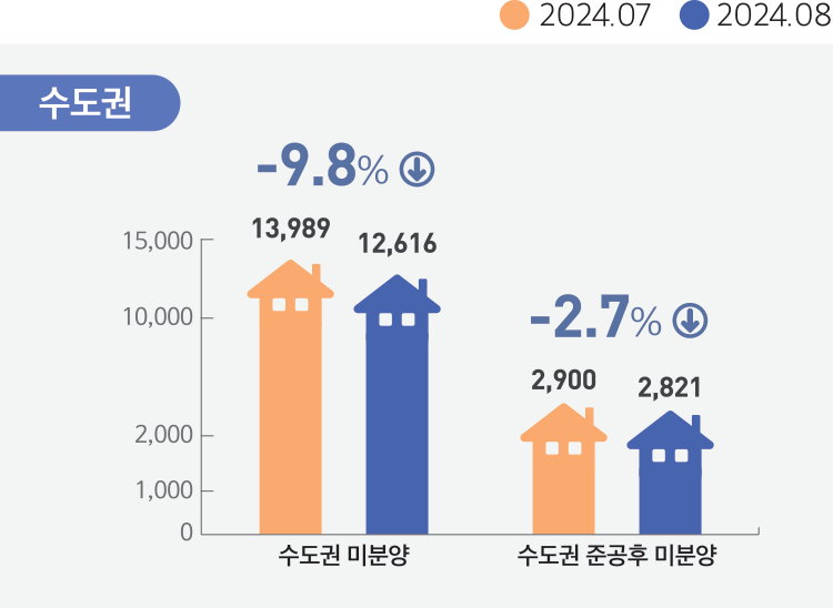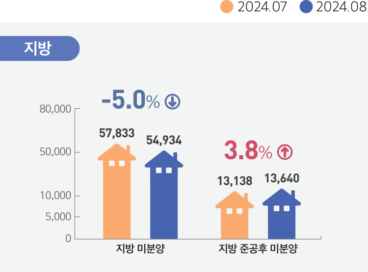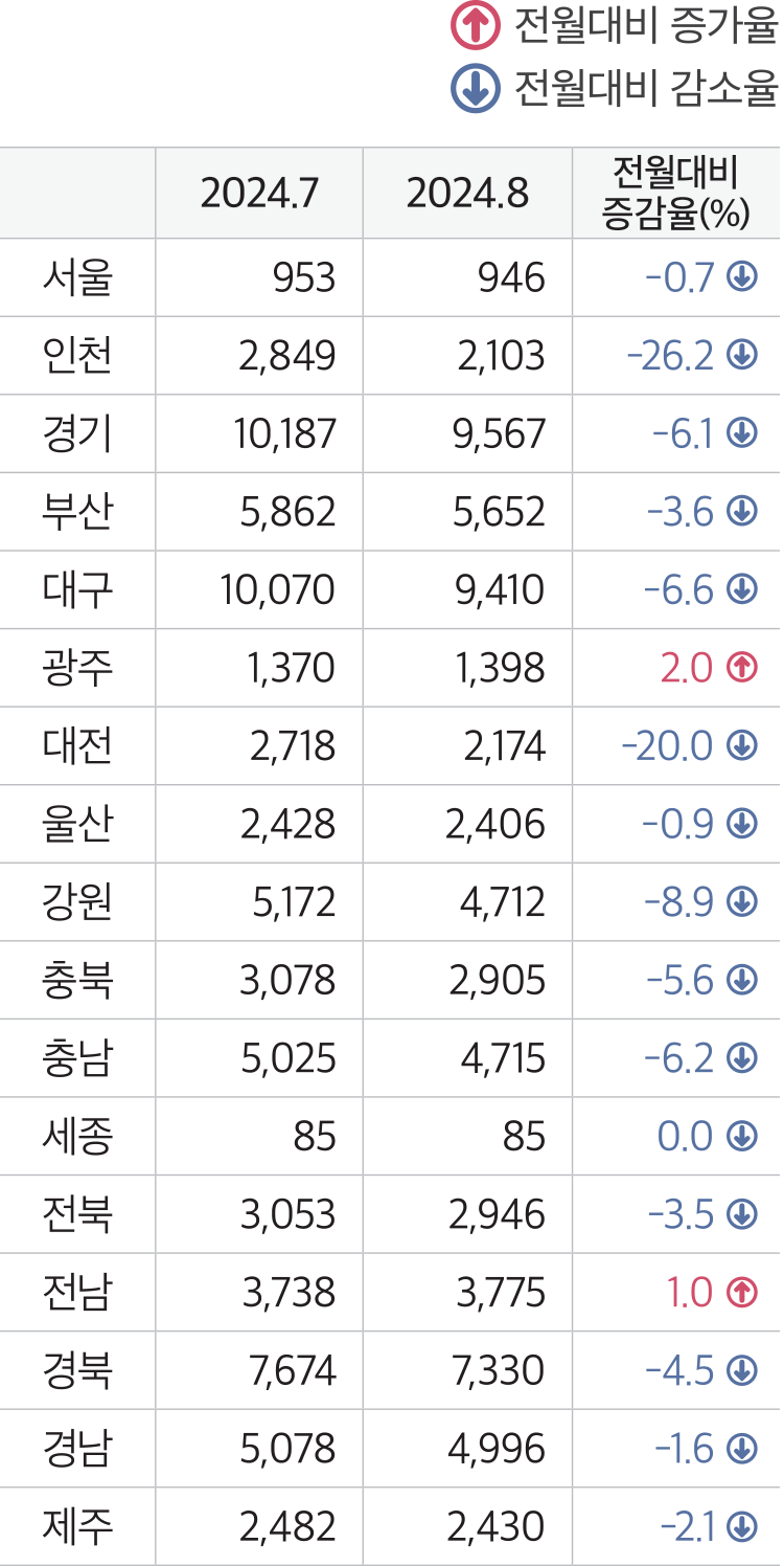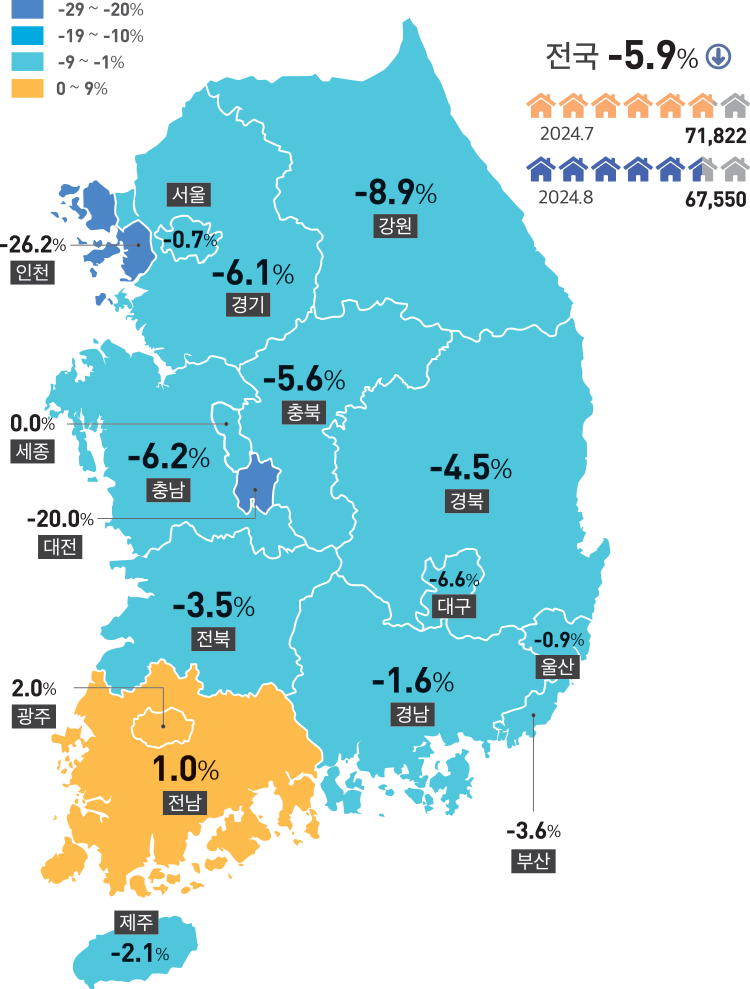 5. 미분양현황 : 2024년 8월말 기준 전국의 미분양주택 67,550호. 전월대비 5.9% 감소