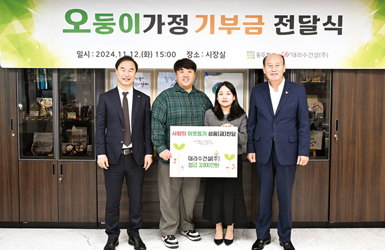 동두천 오둥이 가정에 3,000만원 전달대라수건설(주)(회장 오동식, 광주전남도회 이사, 사진 왼쪽 첫번째)은 11월 12일 동두천 오둥이 가정에 기부금 3,000만원을 전달했다. 오동식 회장은 “동두천시에 다섯 쌍둥이가 태어난 것을 축하하고, 기부금 전달을 통해 축하의 뜻을 전할 수 있어 기쁘다”며, “앞으로 오둥이가 건강하게 잘 자랄 수 있기를 기원한다”고 말했다.