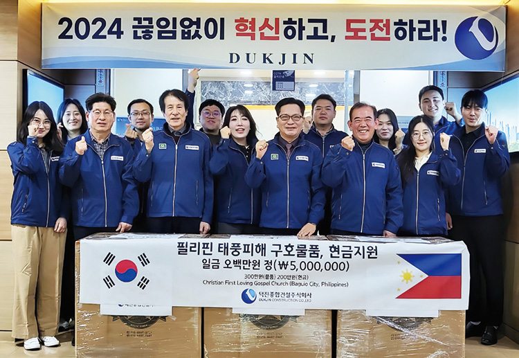 필리핀 태풍피해지역에 구호물품과 현금 지원덕진종합건설(주)(회장 김성은, 울산경남도회장, 사진 앞줄 오른쪽 세번째)은 11월 18일 필리핀을 강타한 태풍 피해지원을 위해 필리핀 바기오 지역에 있는 Christian First Loving Gospel Church에 총 500만원 상당의 구호물품과 현금을 후원했다. 김성은 회장은 “자연재해로 고통받는 필리핀 이웃들에게 희망이 되길 바란다”고 전했다.