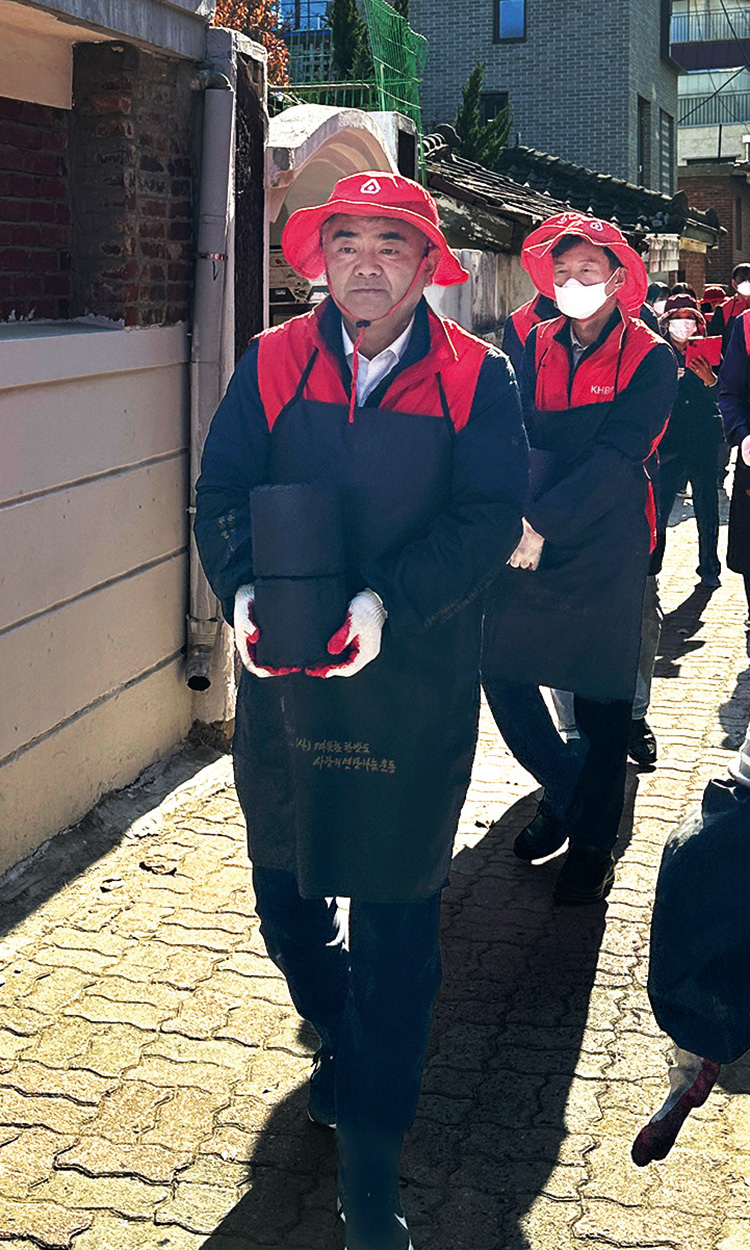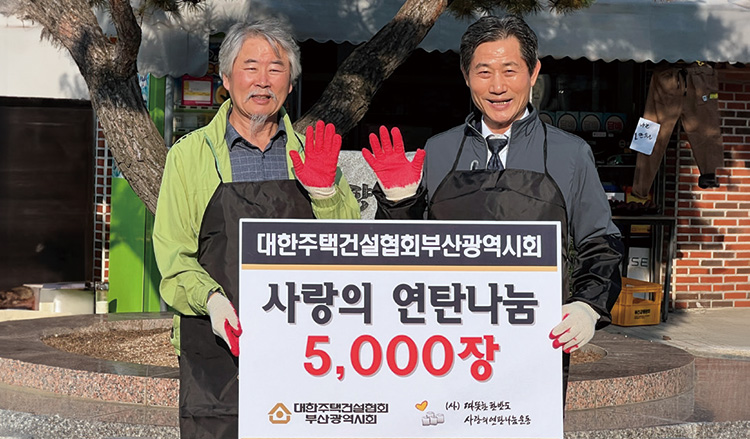 봉사활동 실시부산시회(회장 박재복, 사진 오른쪽)는 11월 12일 회원사 임직원 40여명과 함께 2024년 사랑의 연탄나눔 봉사활동을 실시했다. 해운대구 반여동 소재 3가구에 연탄 600장을 직접 배달해 그 의미를 더했으며, 사랑의 연탄나눔운동본부 부산지부를 통해 총 5,000장(450만원 상당)을 전달했다.