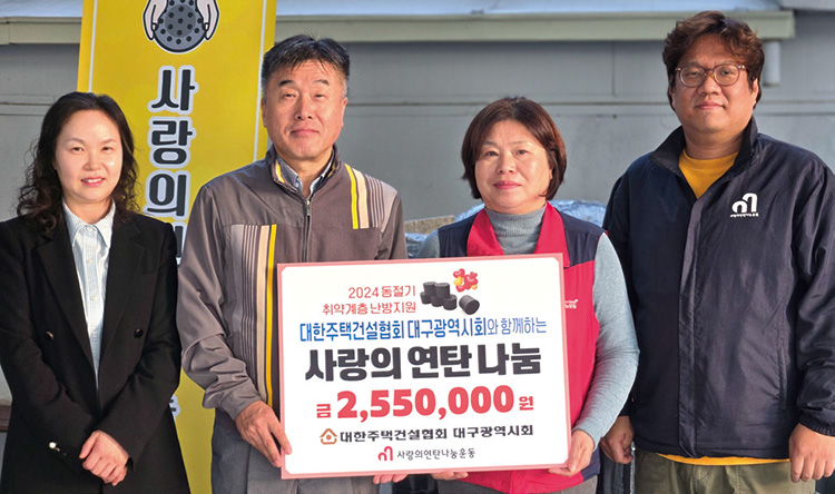 후원금 전달대구시회(회장 조종수)는 11월 13일 사랑의 연탄나눔운동본부 대구지부를 방문해 후원금 255만원(연탄 3,000장)을 전달했다. 이번에 후원한 연탄은 대구 서구 비산동 일대 저소득 연탄 사용 가구에 배포될 예정이다. 사랑의 연탄나눔운동본부 대구지부는 “매년 이렇게 찾아와 준 덕분에 이웃들이 따뜻한 겨울을 보낼 수 있다”며 감사함을 전했다.
