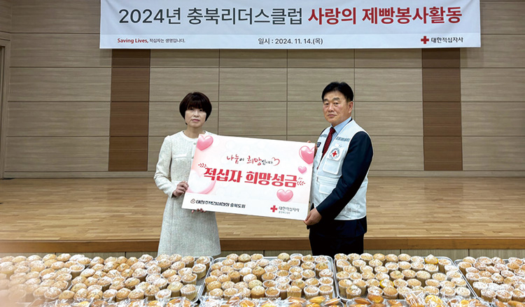 후원금 전달충북도회(회장 김세진)는 11월 14일 대한적십자사 충북지사에서 열린 충북리더스클럽 사랑의 제빵봉사활동 행사에 후원금 100만원을 전달했다. 김세진 회장은 “작년에 이어 올해도 따뜻한 이웃 사랑의 나눔을 실천할 수 있음에 보람을 느끼며, 앞으로도 지속적인 사회공헌활동으로 어려운 이웃을 돕는데 앞장서고 지역상생발전에 이바지할 수 있도록 최선을 다하겠다”고 말했다.