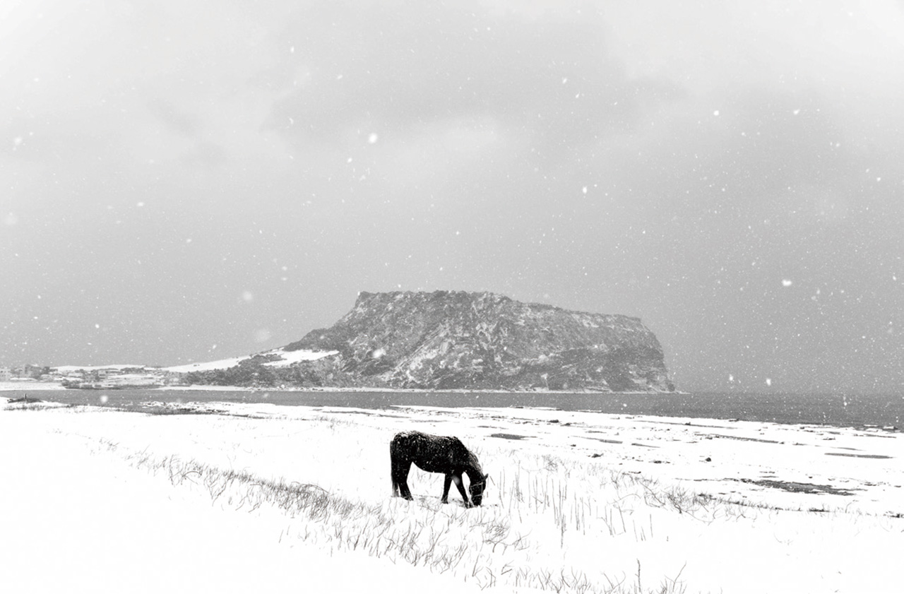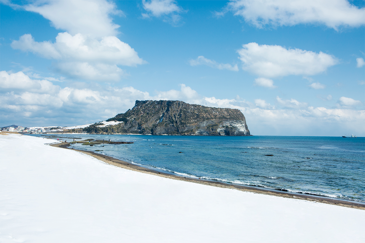 성산일출봉에서 섭지코지로 향하는 길목에 있는 광치기 해변은 제주올레 1코스의 마지막이자 2코스가 시작되는 곳이다. 새하얗게 눈이 쌓여 있는 성산 일출봉과 짙푸른 바다가 어우러진 풍경은 겨울에만 볼 수 있는 장관이다.