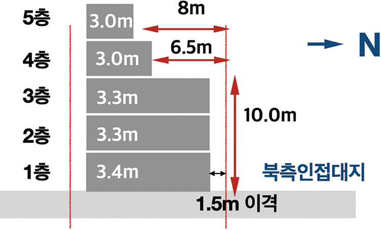 정북방향 인접대지 경계선으로부터 1.5미터 이상 이격 |