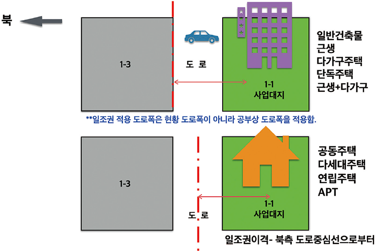 <그림2> 설명처럼 공동주택은 도로의 중심에서 적용을 시작하기 때문에 정북이 인접대지인것보다 일조권적용에 유리한 조건이고 도로의 너비가 넓을수록 일조권적용에 더 많은 완화를 받을 것이다. 그래서 현장에서 흔히 ‘북도로조건’이라고 말하며 도로가 넓을수록 일조권에 유리한 땅이 된다.
