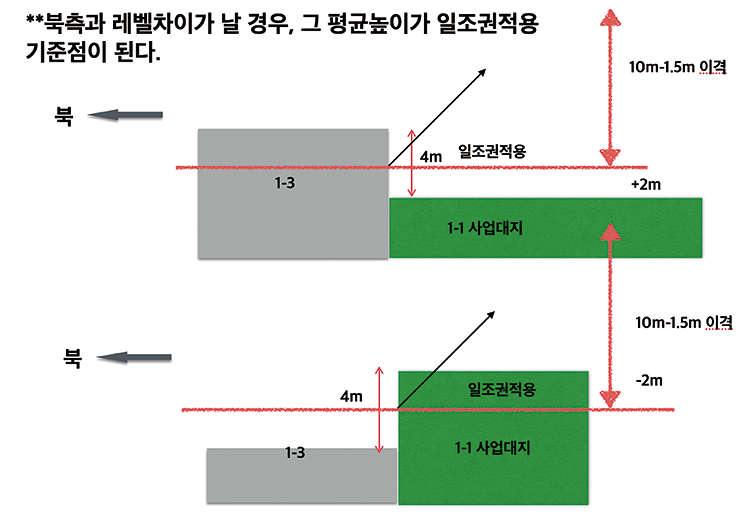 사업대지를 선정할 경우 북측의 상황이 매우 중요한데, 특히 높이 차이가 있는 대지의 경우 일조권 적용 기준이 달라진다. 사업대지와 인접대지간의 높이 차이가 발생할 경우, 그 높이 차이의 평균점이 일조권적용 기준점이 된다. 북측 대지가 높을수록 일조권적용에 유리하며, 북측이 낮으면 일조권적용에 불리하여 건축하는데 제약을 받게 된다. 즉 제약을 많이 받을수록 건축물의 바닥면적이 줄어들게 되며 전체 용적률에 영향을 미치게 된다.