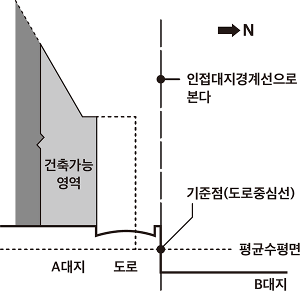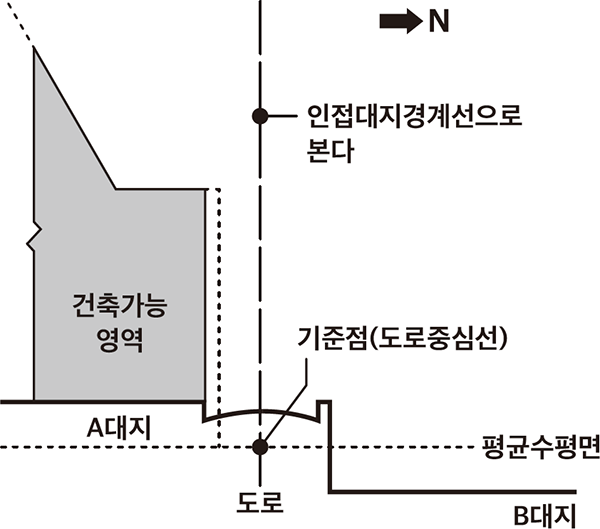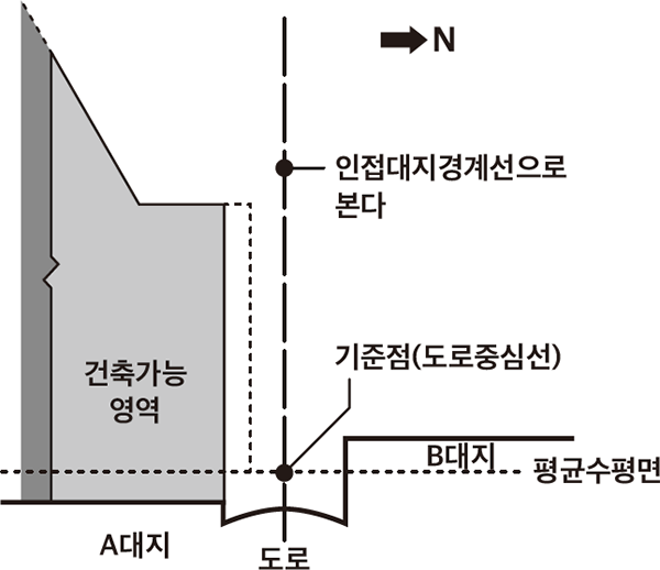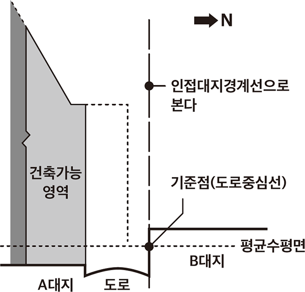 | 북측대지가 높은 경우 | 두 대지간의 높이차의 평균점이 일조권적용 기준이 된다. | 일조권적용에 유리하다. |