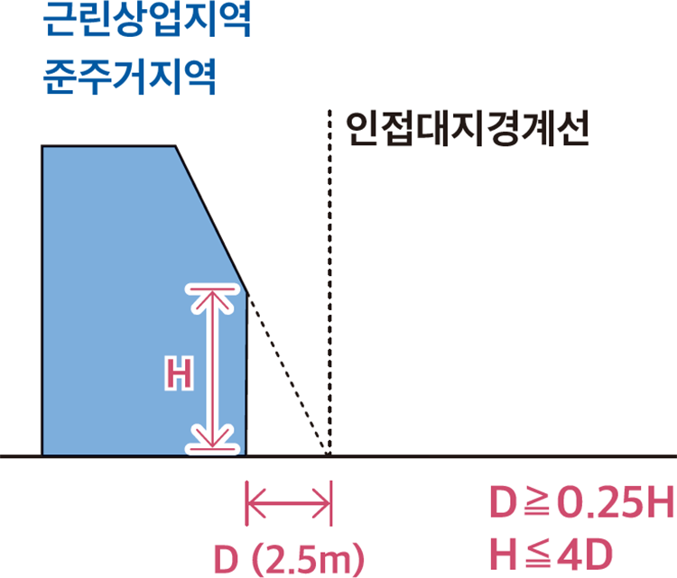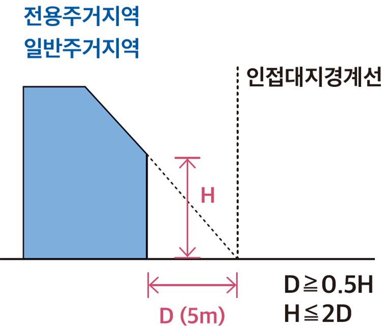 정북방향 인접대지 경계선으로부터 해당 건축물의 각 부분의 높이의 1/2이상 이격 | |