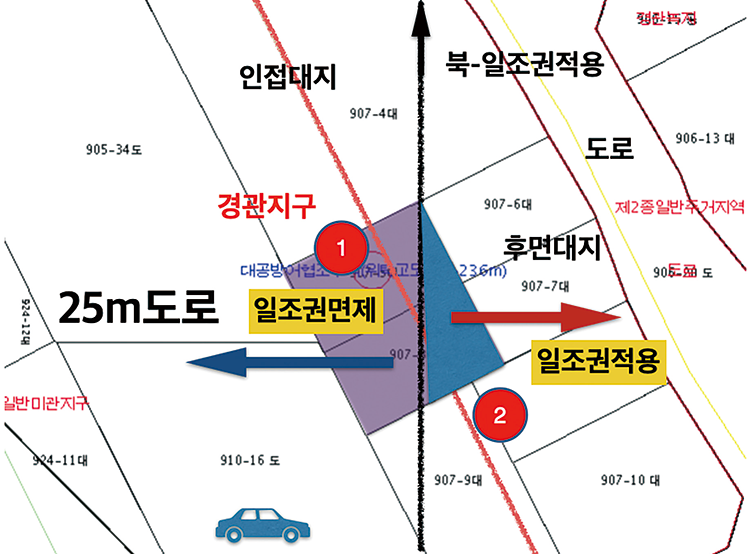 사업대지가 20미터 이상의 도로에 접해 있는 경우에 일조권적용을 받지 않는 경우가 있다. 도시미관을 고려해서 일조권적용을 완화해 주고 있는데 무조건 도로너비가 20미터 이상에 접해있다고 해서 100% 일조권면제를 받는 것이 아니라 대지상황 특히 정북방향의 대지조건이 매우 중요하므로 주의깊게 살펴봐야 할 것이다.