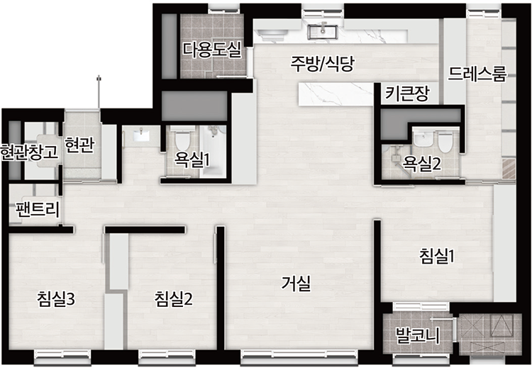 주방 키큰장 주방을 확장하는 유상옵션을 선택하면 주방 상하부장이 늘어난다. 안쪽에 키큰장도 설치돼 수납 용량이 대폭 커진다.