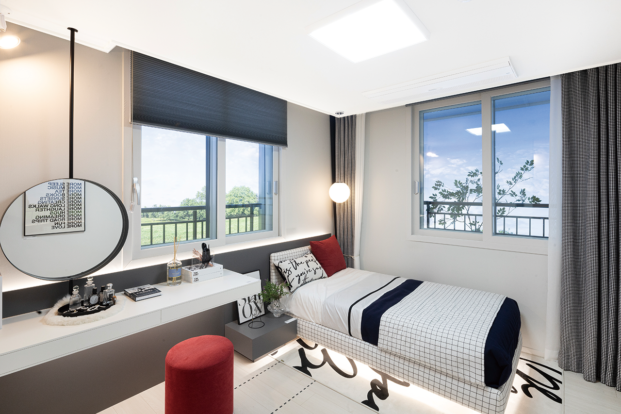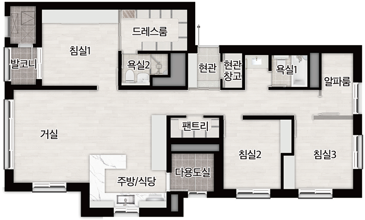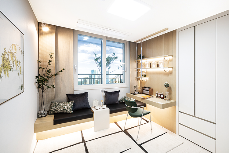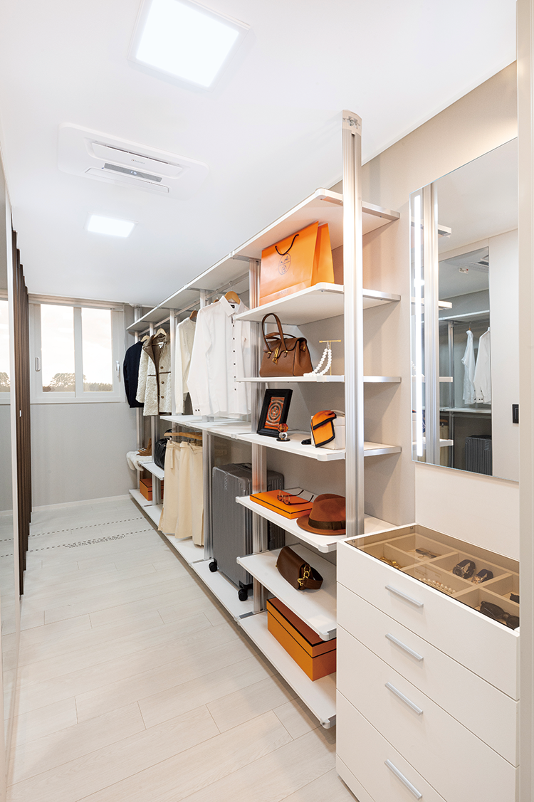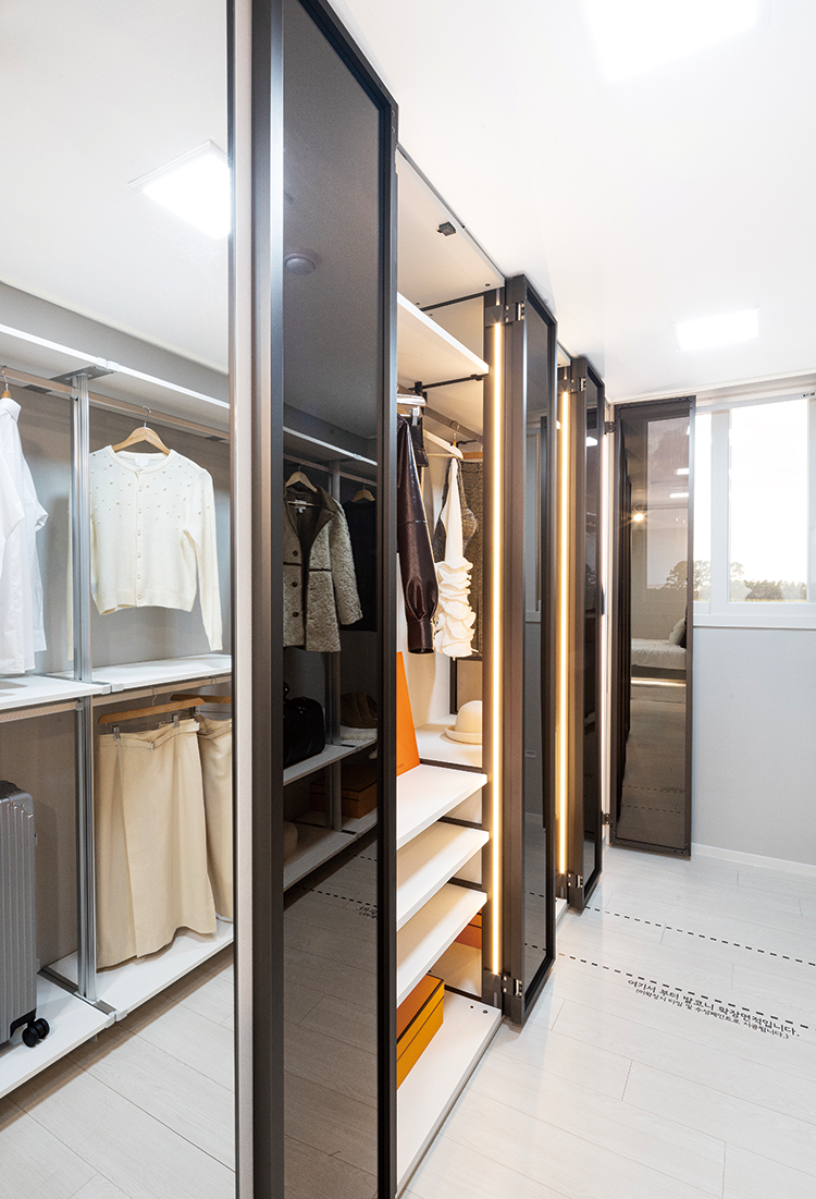 알파룸 방 안의 방처럼 넓은 공간을 확보한 확장형 드레스룸을 선택할 수 있다. 조명형 거울이 있는 화장대, 시스템선반, 제습기 등이 설치된다. -