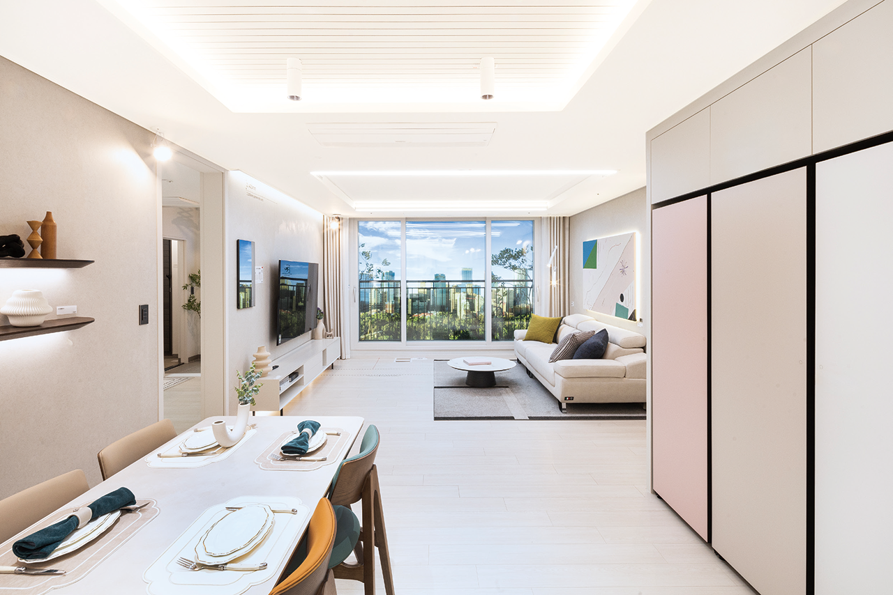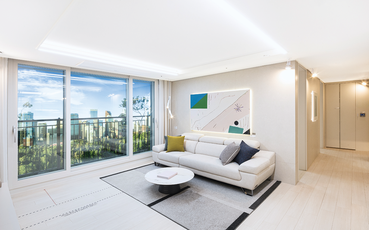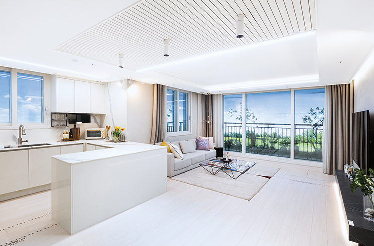 양면 개방형 거실 양면으로 창이 있는 개방감 좋은 거실이 자리한다. 주방과도 소통하는 구조다. 거실 라인등과 주방 천장의 직부등, 라인등 등을 유상옵션으로 설치해 분위기를 살릴 수 있다.