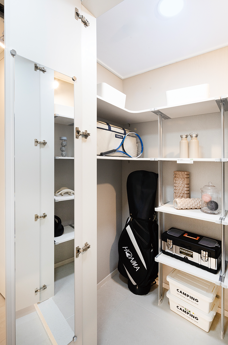 현관창고 시스템선반이 기본으로 갖춰진 대용량 현관 창고가 설치된다. -