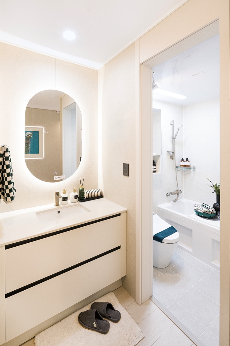 욕실1 공용욕실 입구에 독립형 세면대와 조명 거울, 하부 수납장을 배치해 욕실 공간과 분리하고 있다. -