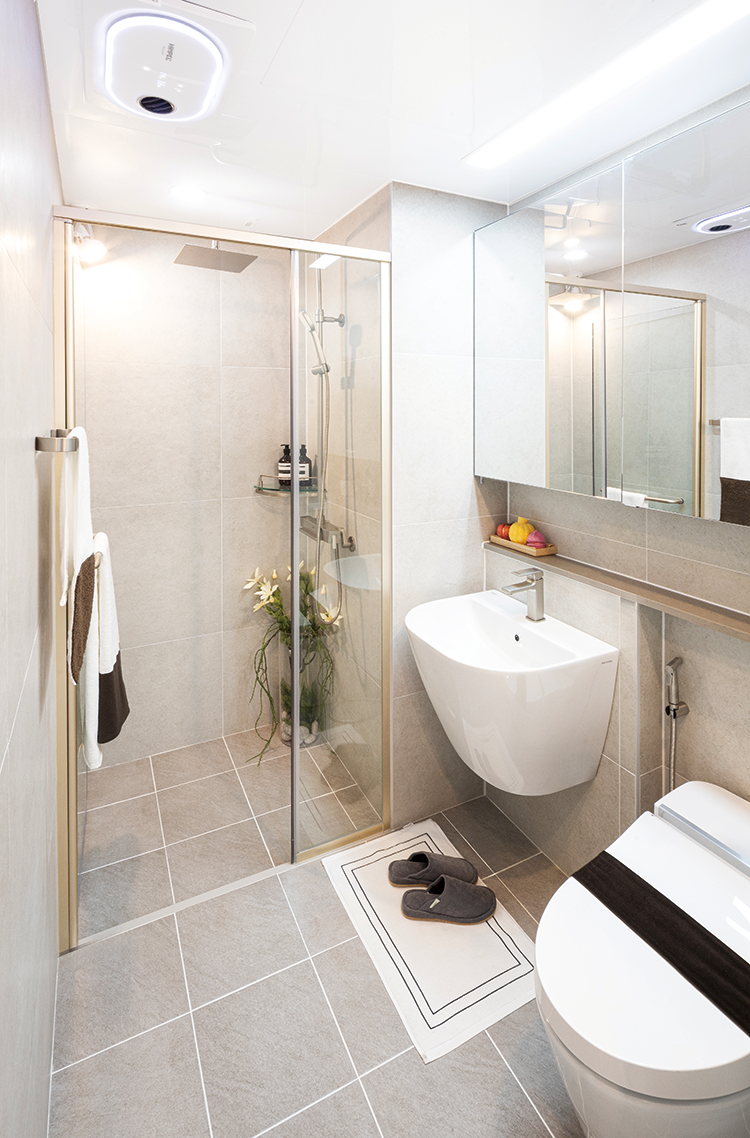 욕실2 안방 욕실에는 샤워부스가 설치된다. 대형타일 시공을 선택할 수 있는 유상옵션이 제공된다. -