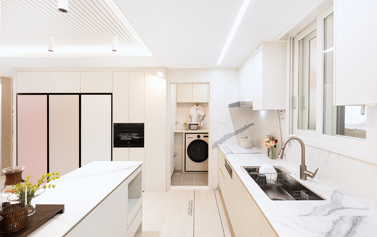 고급 주방 옵션 주방 확장시 주방 벽과 상판을 세라믹으로 마감하고 고급 수전류와 상부장 간접조명 등을 설치할 수 있다. 조명특화 유상옵션을 선택해 주방 천장에 라인등을 깔끔하게 매입할 수도 있다. -